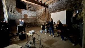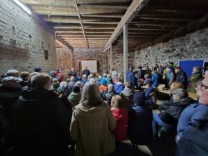Der geöffnete Teil der Scheune füllte sich schnell bis auf den letzten Platz. Einige Gäste verfolgten die Präsentation daher auch vor der Scheune – und ließen sich dennoch gebannt auf das Geschehen ein. Die Mischung aus visuellen Elementen und akustischen Beiträgen nahm das Publikum mit auf eine Reise durch verschiedene Epochen des Konsums und der Werbung, von früheren Zeiten bis hinein in unsere Gegenwart. Der Abend regte zum Nachdenken an, ohne belehrend zu sein, und schuf Raum für Austausch und neue Perspektiven.